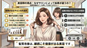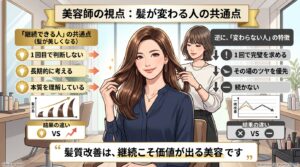 酸熱トリートメントは一時的。髪質改善は継続的に育てるものです。