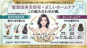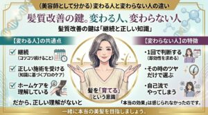 でも逆に言えば、正しい美容室での髪質改善とホームケアを組み合わせれば、髪は確実に変わります。